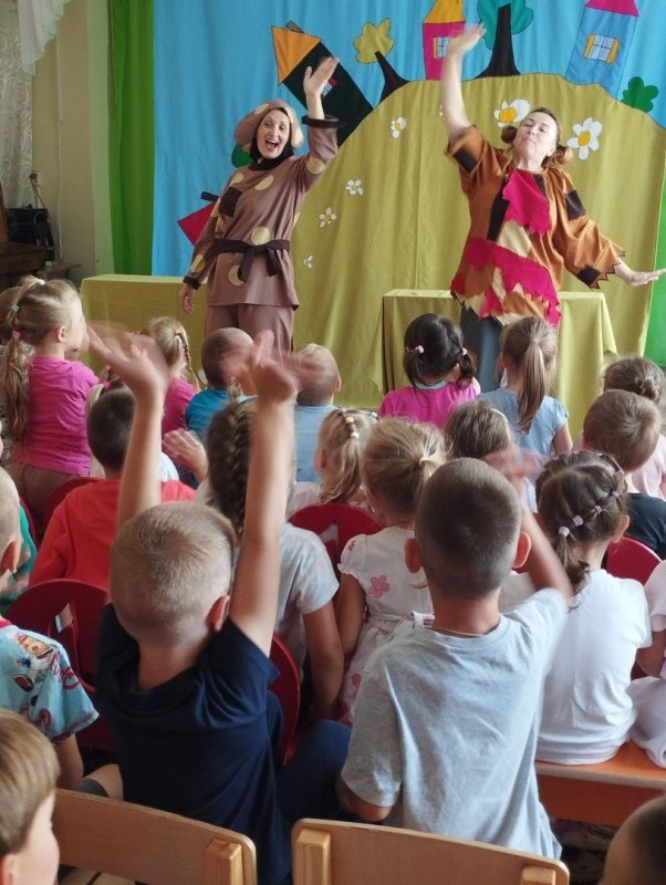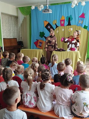 Начался новый учебный год, значит и новые встречи для воспитанников. Сегодня мы встречались с добрым театром Франт. В их исполнении смотрели спектакль "Сказки одной деревеньки". Содержание: двум ленивым домовушкам умная мышка сказала, что их будут любить тебя, кому живётся хуже, чем им. В процессе спектакля домов ушки помогали короче, свинье, гусыне, курице. И всё их полюбили. Главная мысль спектакля, которую определили дети - не лениться, и всё получится! Как всегда детям было интересно, весело, не скучно. Помогая героям, они принимали активное участие в разных играх, эстафетах. Выполняли задания домовушек. Выражаем огромную благодарность артистам театра Франт.