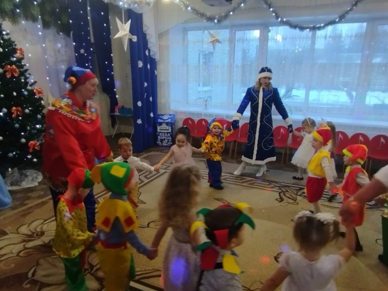 ????Ребята танцевали и водили хоровод у нарядной ёлочки со Снегурочкой и Петрушкой. С улыбкой и радостью встретили доброго Дедушку Мороза, вместе с которым станцевали задорный танец, рассказали стихотворение,помогли найти новогодние подарки и на память все вместе сфотографировались.