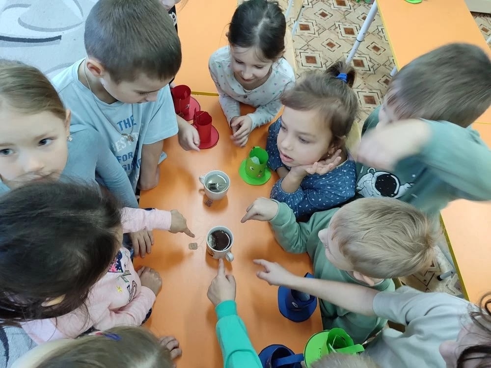 ???? Научный эксперимент «Горячий и холодный»: Самой зрелищной частью дня стал эксперимент! Мы взяли два одинаковых чайных пакетика. Один залили горячей водой, а другой – холодной. Дети с восторгом наблюдали, как в горячей воде чай быстро заваривается, окрашивая воду, а в холодной – почти ничего не происходит. Этот наглядный опыт помог понять важность температуры воды для чаепития.