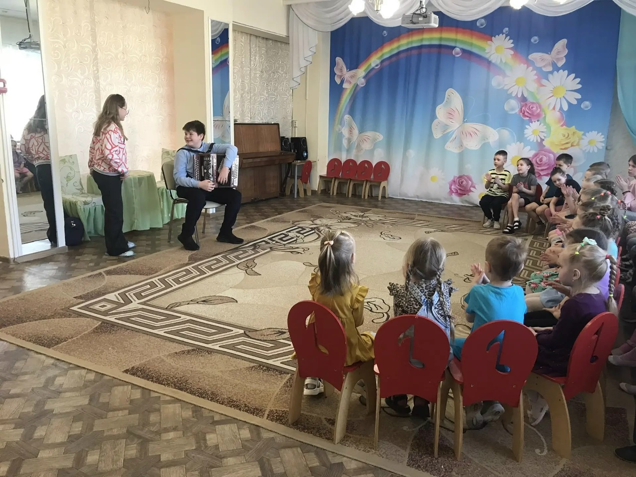 8 апреля к нам в детский сад приходили учащиеся школы 16, наши бывшие воспитанники Владислав и Алиса Лисовы. Они провели для детей старшей и подготовительной группы музыкальную встречу. Владислав исполнил для детей несколько музыкальных произведений на гармони, а Алиса спела для ребят песню «Вишня белоснежная». Детям очень понравилось выступление Владислава и Алисы. Они даже подпевали знакомую им «Катюшу». Встреча с нашими гостями продолжилась в группе. Владислав показал ребятам свою гармонь и рассказал как устроен этот музыкальный инструмент. Дети с удовольствием рассматривали гармонь, нажимали кнопки и даже растягивали меха. Такие музыкальные встречи формируют у дошколят интерес к народным музыкальным инструментам и русской народной культуре, расширяют кругозор и развивают музыкальный слух. Мы рады встречам с нашими бывшими воспитанниками.
